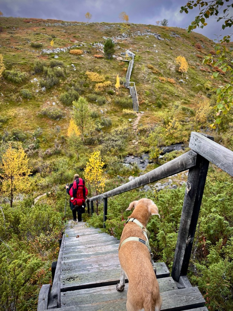 Koira oli hieman ihmeissään, mihin taas lähdetään, vaikka leiri oli jo pystyssä. Edessämme oli taas jyrkkä portaikko, joka vei meidät ylös tunturiin hyvin nopeasti. Kävelimme ripein askelin ja välillä kuvailimme maisemia ja ruskan värejä. Vastaamme tuli pariskunta, jotka olivat matkalla samalle leiripaikalle, josta olimme iltakävelyllemme aloittaneet.