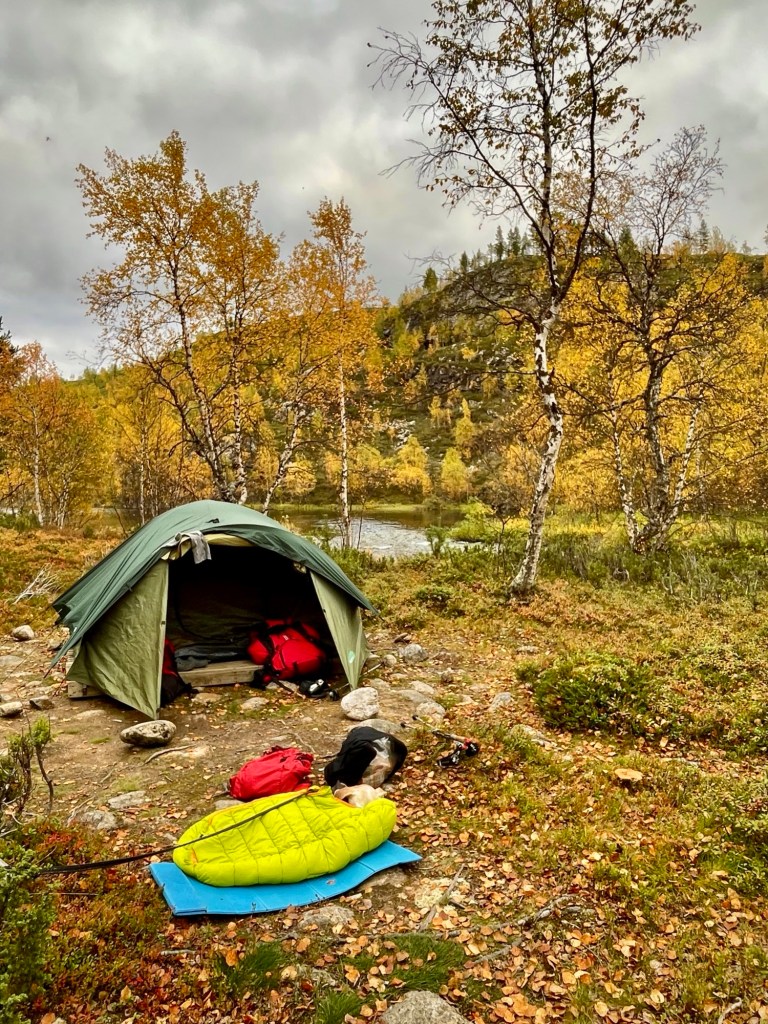 Yöllä heräsin pissalle ja jäin sen jälkeen ihailemaan tähtitaivasta. Haaleat revontulet kulkivat pitkin taivasta syttyen ja sammuen. Yhtäkkiä näin kirkkaan tähdenlennon ja voi, miten onnekkaaksi se tekikin oloni. Siinä samassa hetkessä päätin, että tähän maagiseen leiripaikkaan haluan vielä joskus palata.