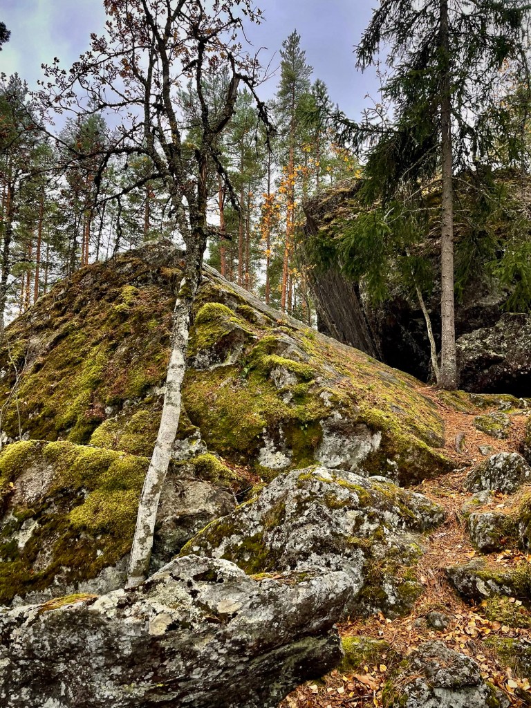 Reitin alku oli tosiaan taajama-aluetta ja jonkun matkaa joutui kävelemään kevyen liikenteen väylää, kunnes polku hyppäsi metsään kohti Höytämöä ja Hirvi-Simunan luolaa. Vaihtoehtoisesti tämän pienen lenkin voi ohittaa, mutta mielestäni se oli ihan mielenkiintoinen paikka. Oli ihanaa päästä polulle ja metsä tuntui jotenkin heti niin ihanan omalta ja turvalliselta. Vajaan kilometrin kuluttua maastosta alkoi erottumaan yhä suurempia kivenlohkareita ja kohta niitä oli vastassa varsinainen röykkiö. Suuret siirtolohkareet tuntuivat olevan alueella muutenkin todella yleisiä.