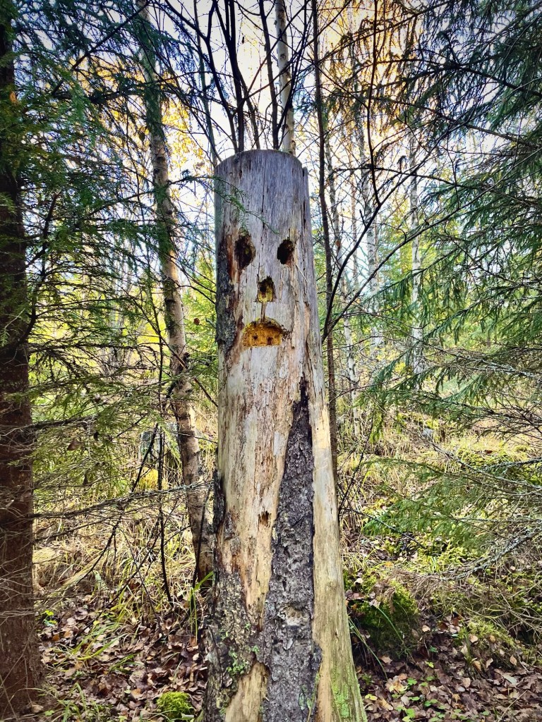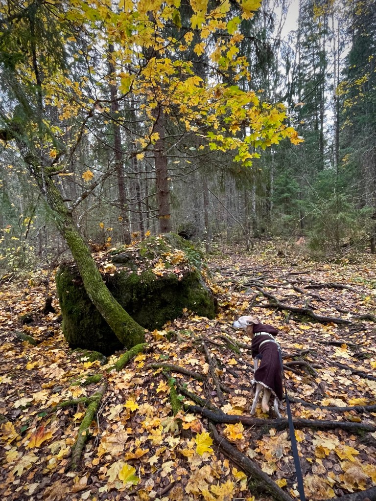 Röykkiön vieressä oli luonnon muistomerkistä muistuttava kyltti. Tarina kertoo, että luoliston lähellä asusteli 1800-luvun alussa Hirvi-Simuna -niminen metsästäjä, jolla oli lähes yliluonnollisia metsästyskykyjä. Hirvi-Simuna päätti päivänsä yhteen luolista. Luolia olisi ollut kiva tutkia enemmänkin, mutta koirani takia päädyin vain ihailemaan suuria kiviä kiertämällä niitä ympäri. Vaikuttava paikka.