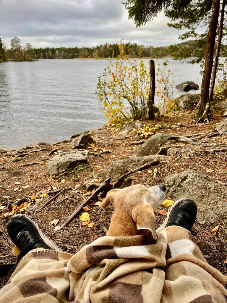 Vetäydyimme koirani kanssa kallion suojaan istuskelemaan ja katselemaan järvimaisemaa. Koska olin lyhyellä vaelluksella, oli mukana kaikenlaista luksusta, kuten isohko fleece-viltti. Oli ihana vetää toppatakki päälle ja levittää lämmittävä viltti jalkojen päälle ja istuskella kallioon nojaillen. Olen oppinut itsestäni, että on huomattavasti helpompaa nauttia tällaisesta vuodenajasta, jos tauoilla on mahdollisuus laittaa niin paljon vaatetta päälle, että istuskelun aikana ei tule kylmä. Söin lounaan ja jälkkäriksi toisen ostamistani munkeista. Oli mukavaa vain olla kiireettömästi paikallaan ilman mitään sen kummempia suunnitelmia.