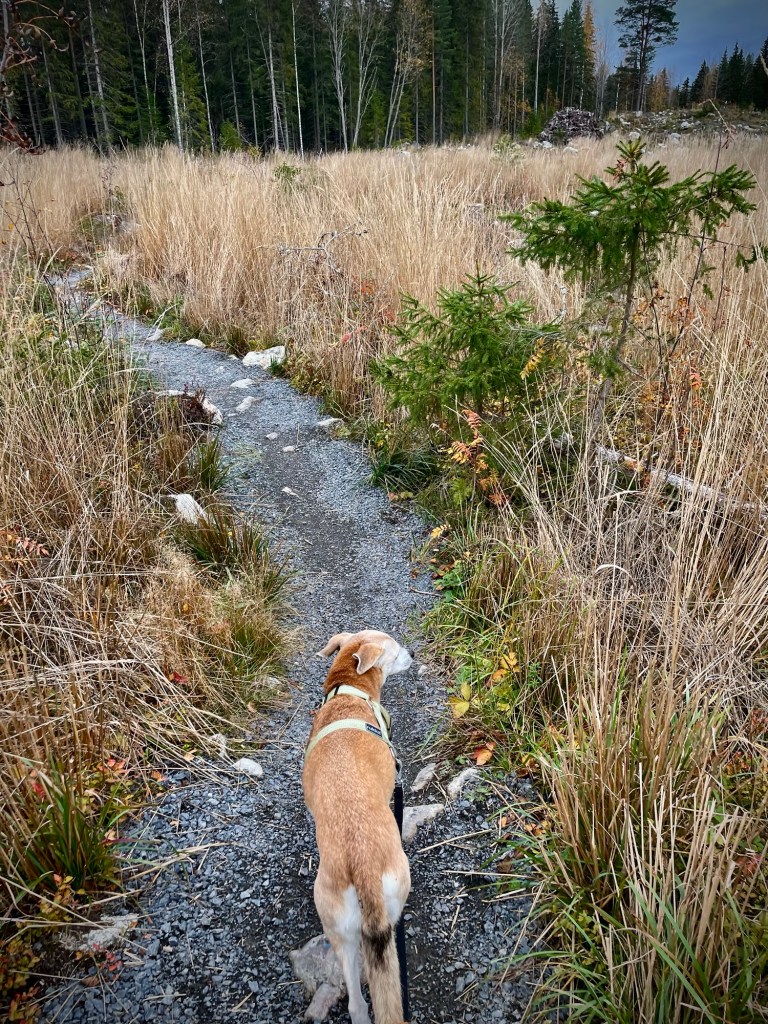 Toteutin vaellukseni lokakuun puolessa välissä ja sijoitin vaelluspäivät arkipäiviin. Arvelin, että näin lähellä taajamia oleva reitistö on todennäköisesti viikonloppuisin ruuhkaisampi. Kävin aamulla Sääksjärvellä kaupassa hakemassa muutamat tuoreet munkit mukaan ja jätin autoni keskustan tuntumaan, Sääksjärventien ja Kannistontien risteyksessä sijaitsevalle parkkipaikalle, joka on nimenomaan tarkoitettu ulkoilijoille ja Birgitan polun kävijöille. Mukana vaelluksella oli oma koirani.