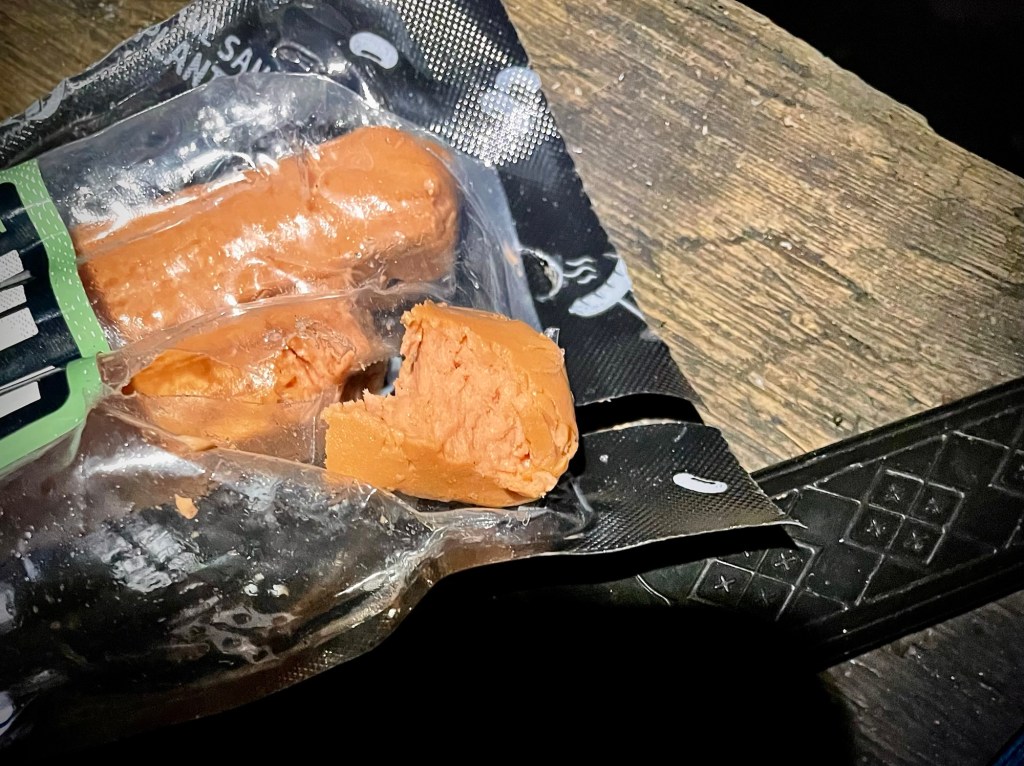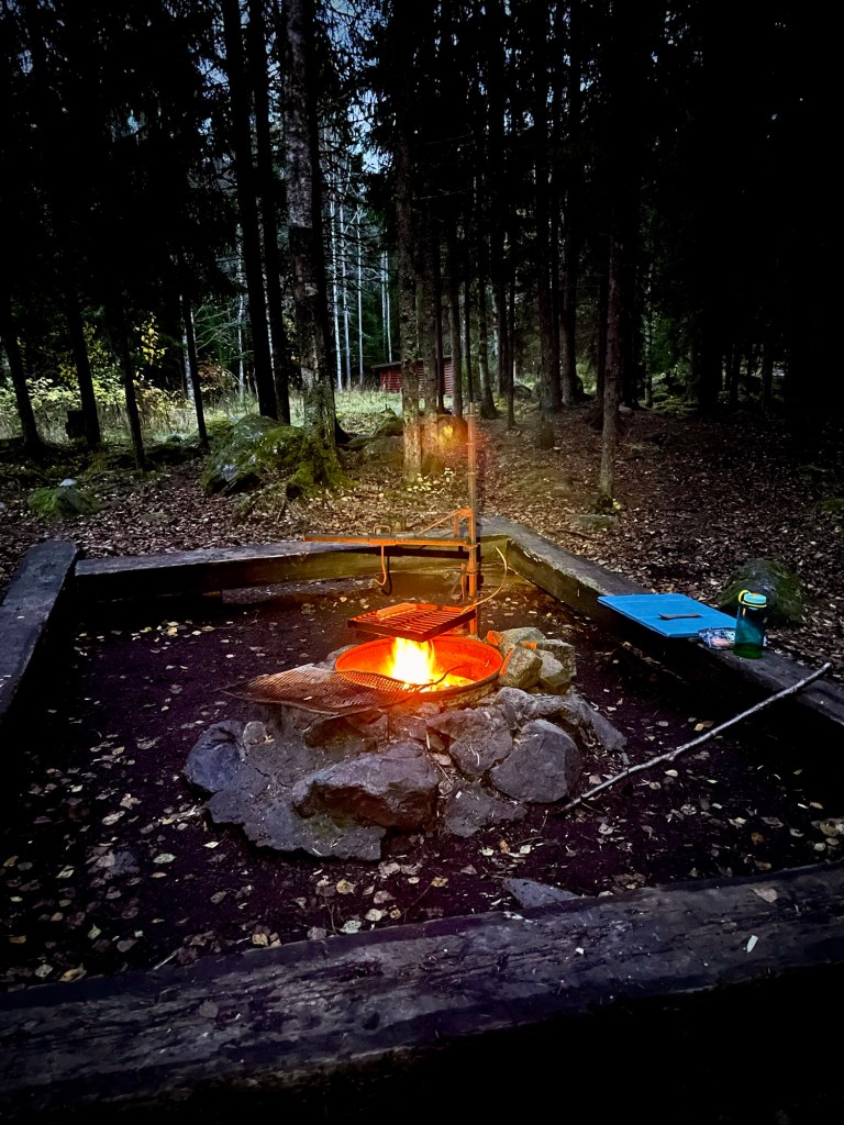 Hämärä alkoi laskeutumaan ja tein iltatoimia. Satunnaiset ulkoilijat kävivät kääntymässä laavulla ja vaihdoin heidän kanssaan muutaman sanan. Koska hämärä tuli tähän vuodenaikaan aikaisin ja vaellus oli lyhyt (puhelimen akkua tai varavirtaa ei tarvinnut säästellä), katselin teltassa Alone Suomen ensimmäistä kautta. Mikäs sen parempi ympäristö seurata muiden selviytymisseikkailuja, mukavasti makuupussissa suklaata mussuttaen.