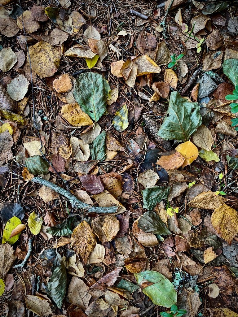 Hämärä saapui kovaa vauhtia ja välillä lehtien täplittämässä maastossa polun erottaminen oli vaikeaa. Onneksi siellä täällä oli oransseja reittimerkkejä, jotka antoivat jonkunlaista vinkkiä polun sijainnista.