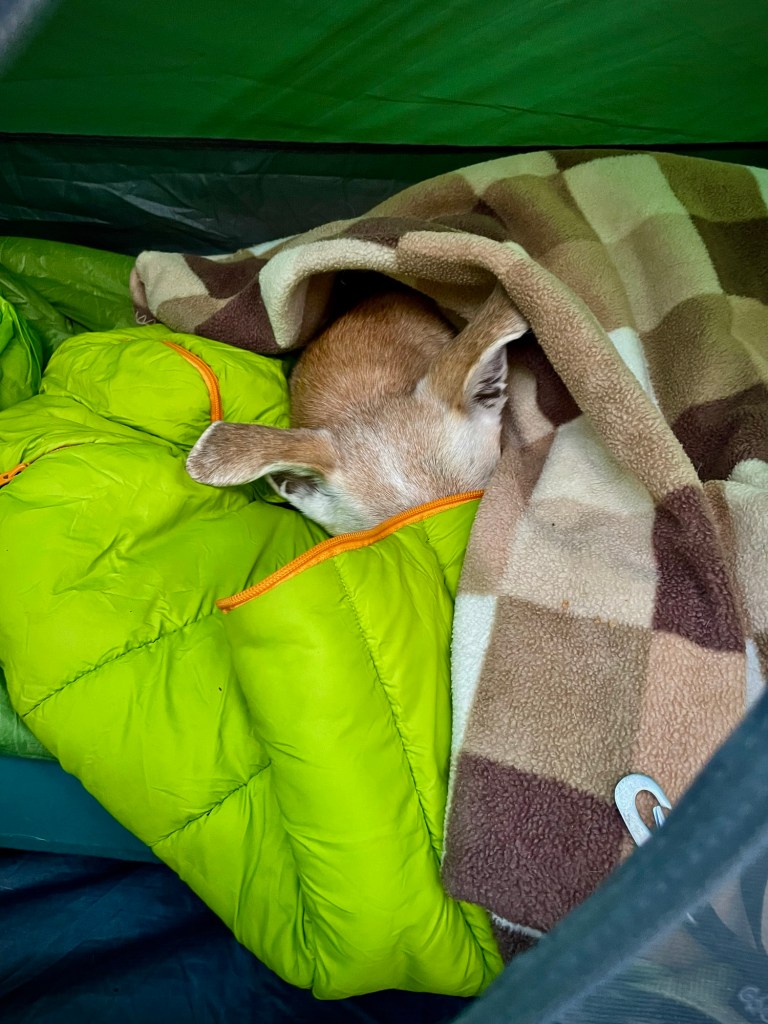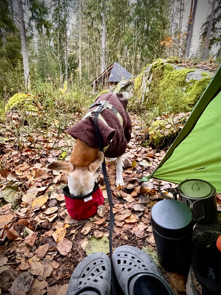 Saapuessani Vähä-Kausjärvelle oli jo oikeasti lähes pimeää. Nuotiopaikalla oli perhe ja he kysyivät ystävällisesti, haluanko myös tulistella ja jätetäänkö tulet palamaan, kun he lähtevät. Aloin vauhdilla pystyttämään telttaani ja huikkasin, että voisin tulla paistamaan makkaraa hetken päästä. Laitoin leirin pystyyn, jonka jälkeen ruokin koiran ja saatoin hänet yöpuulle peitellen omaan makuupussiin.