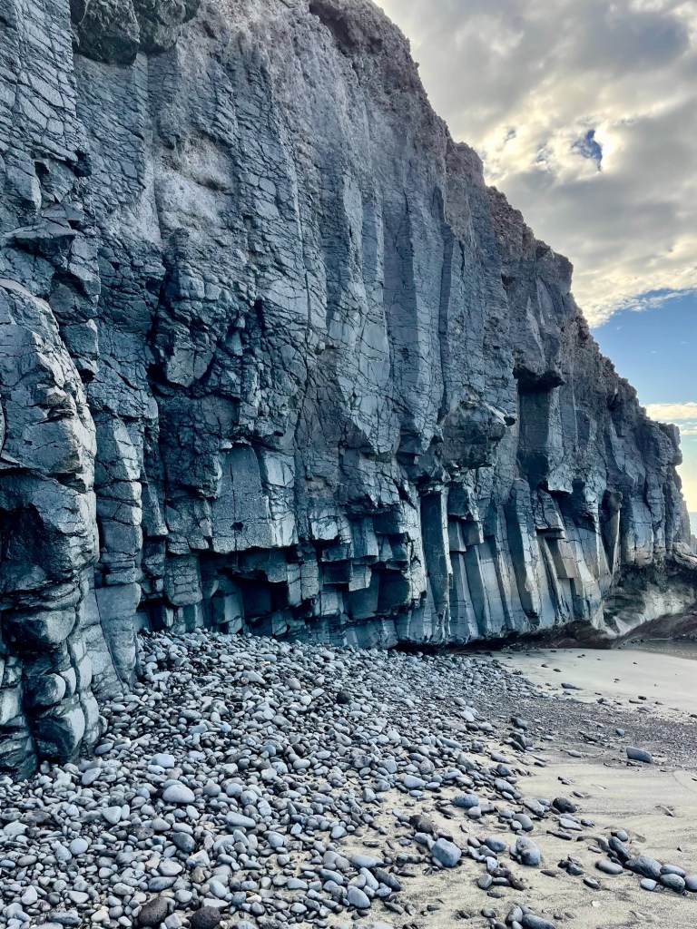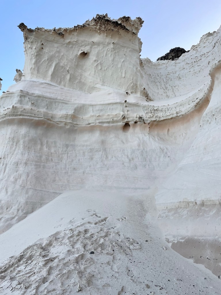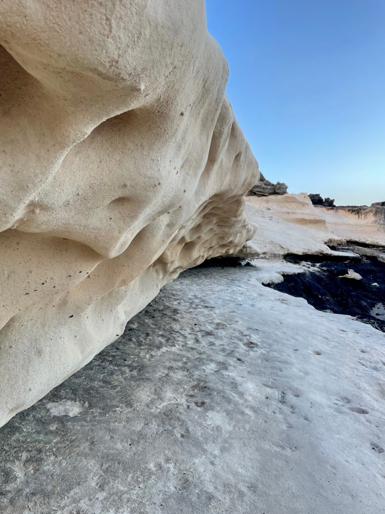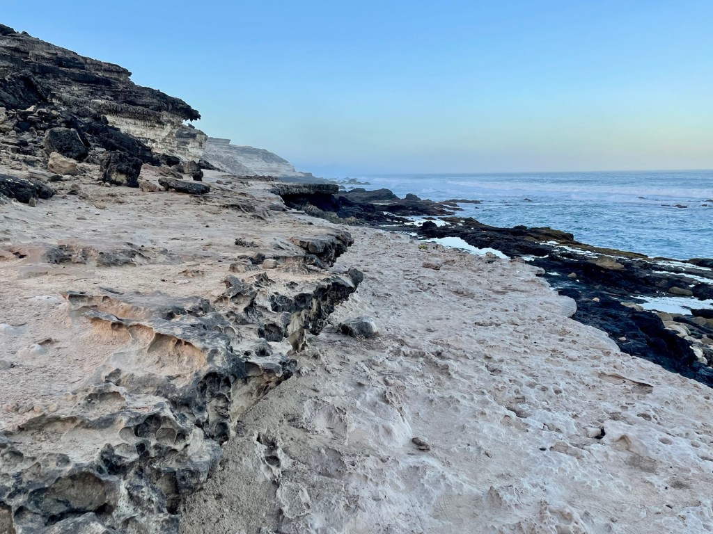 Aavikolla järjestetään erilaisia mökijäsafareita ja siellä risteili teitä, joissa oli kovempi pohja. Eli eteneminen oli loppujen lopuksi aika nopeaa. Meri oli suhteellisen lähellä ja päätin poiketa katsomaan maisemia ja onneksi poikkesin! Laskeuduin hiekkakivistä rinnettä alas ja täällä oli upeita meren muokkaamia seinämiä. Seinämän ja meren välissä kulki aivan kuin tehty kävelykatu, joka oli kuitenkin täysin luonnon muokkaama. Kuljin rannan muodostelmia tutkiskellen pari kilometriä eteenpäin, jonka jälkeen palasin viralliselle reitille. Ranta oli jäänyt sopivasti seinämien varjoon ja aamukävelyni oli ollut mukavan viileä. Sieltä ylös noustuani kova paahde iski vastaan.