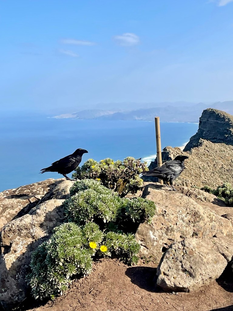 Rinkka toi nousuun mukavaa lisähaastetta, mutta onneksi se oli jo keventynyt parin viikon aikana ja vettä oli sopivasti noin litran verran mukana. Saavutin huipun ja sain olla siellä hetken yksinäni korppien kanssa. Huipun toisella puolen oli jyrkkä pudotus alas rannikolle ja maisemat avautuivat hienosti joka suuntaan. Maisemat ulottuivat aina vaelluksen lopetuspisteeseen saakka. Aikani fiilisteltyäni lähdin paluumatkalle ja vastaantulijoiden määrää ajatellen, olin erittäin tyytyväinen, että olin lähtenyt matkaan aikaisin aamulla. Tuuli viilensi kulkua tehokkaasti ja vasta lähestyessäni reitin loppua, oli pakko vähentää vaatteita. Nyt kuljin turvallisesti pääreittiä pitkin ja kohta tupsahdinkin Morro Jablen kaupunkiin. Kävelin suoraa päätä kauppaan ostamaan juotavaa ja sen jälkeen suunnistin rannalle.