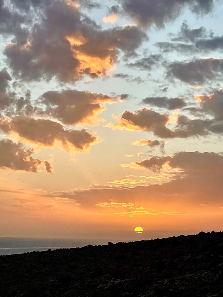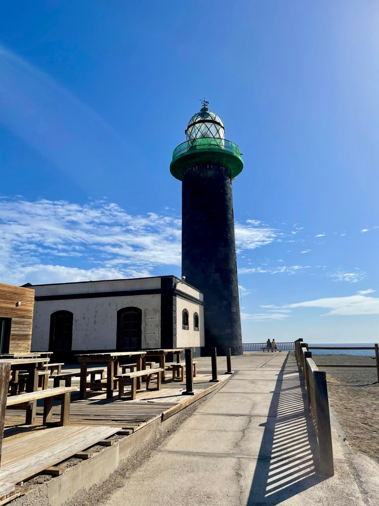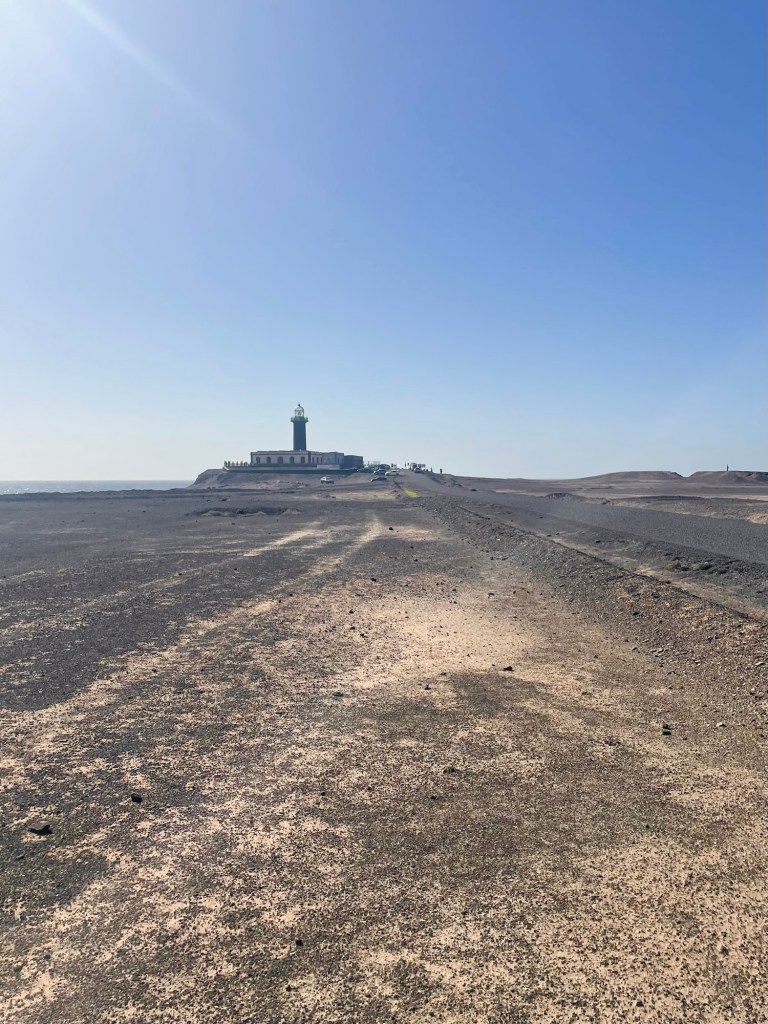 Aavikkomaisen taipaleen jälkeen saavuin saaren pohjoisosaan, jossa on majakka. Täältä avautuivat näkymät saarelle sekä Lanzaroten puolelle. Oli hauska katsella Lanzaroten suuntaan ja etsiä tuttuja maamerkkejä, joissa oli muutama päivä sitten vaeltanut. Majakan alapuolella oli GR131-reitin infotaulu ja siitä lähdin seuraamaan reittiä takaisin päin kohti El Muellea, josta laiva lähtisi muutaman tunnin päästä takaisin Corralejoon. Kun vastaan tuli risteys, josta pääsi poikkemaan tulivuoren päälle, tein pikaiset aikataululaskelmat ja niiden puitteissa lähdin kulkemaan vuorelle vievää tietä pitkin. Kohtuullisen hengästyttävän nousun jälkeen olin Montaña La Calderan huipulla ja kovassa tuulessa napsin kuvia joka suuntaan. Huipulla tuli nopeasti kylmä, joten lähdin laskeutumaan takaisin. Olin hyvissä ajoin takaisin satamassa ja lähdin uudelleen paikkaan, jossa ravintolat sijaitsivat. Istuskelin laiturilla ihailemassa maisemia ja hieno sateenkaari näyttäytyi pilviä vasten.