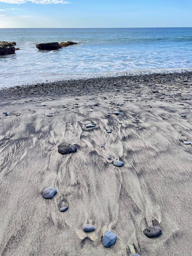 Lähdin kiertämään karun kaunista saarta vastapäivään. Hiekkarantojen lomassa oli karkeaa mustaa laavakiveä, jotka muodostivat rosoisia kallioita maisemaan. Meri loisti turkoosina ja mukavan viileä tuuli ja satunnaiset pilvet toivat helpotusta paahteeseen. Noin kilometrin kävelyn jälkeen tuli vastaan ravintolat ja suosittu alue, jossa ihmisiä vietti aikaansa uimassa, kahlailemassa matalassa rantavedessä, ottamassa aurinkoa, istumassa laiturilla jne.