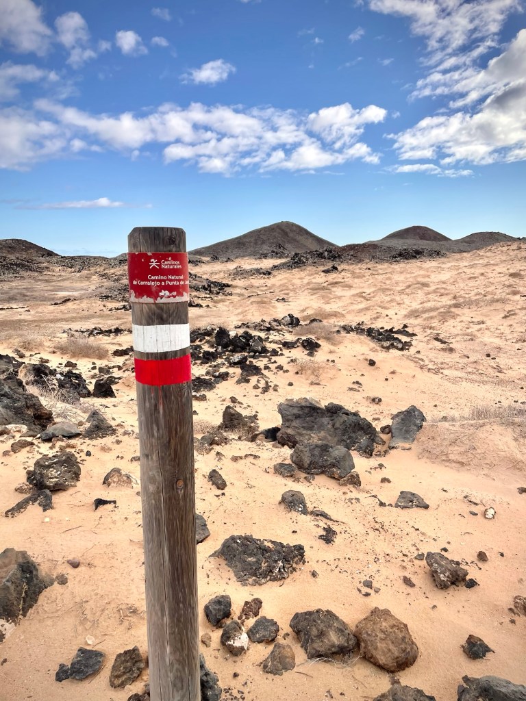 Söin aamupalan hostellilla ja lähdin noin klo 7:30 matkaan. Suuntasin Corralejon keskustassa sijaitsevalle reitin viralliselle aloituspaikalle ja vastassa olikin vain sotkuinen parkkipaikka, jossa kyltti on todennäköisesti aikoinaan sijainnut. Ensimmäisen maalatun reittimerkin löysin kuitenkin katukivetyksestä heti parkkipaikan ulkopuolelta, joten olin ainakin oikeassa paikassa. Lähdin kävelemään ulos Corralejosta, ja vaikka kaupunki ei ole mikään erityisen suuri, tuntui ikuisuudelta päästä sieltä ulos. Tie vei erilaisille asutusalueille sekä rakennustyömaille ja kääntyi lopulta hiekkatielle, joka viimein tuntui rauhallisemmalta kaiken hälinän jälkeen.