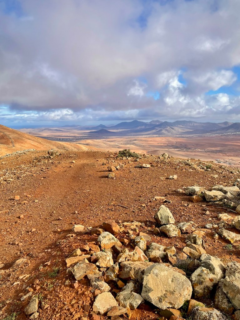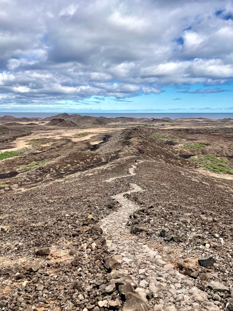 Ylöspäin mentäessä maisemat avautuivat upeasti molempiin suuntiin. Olin suoraan sanottuna Fuerteventuran katolla. Tuuli oli paikoin niin voimakas, että jouduin välillä ottamaan sivuaskelia pysyäkseni pystyssä. Mutta tämä “katolla kulkeminen” oli juuri sitä lempimaisemaani, enkä olisi ollut missään muualla mielummin kuin täällä.