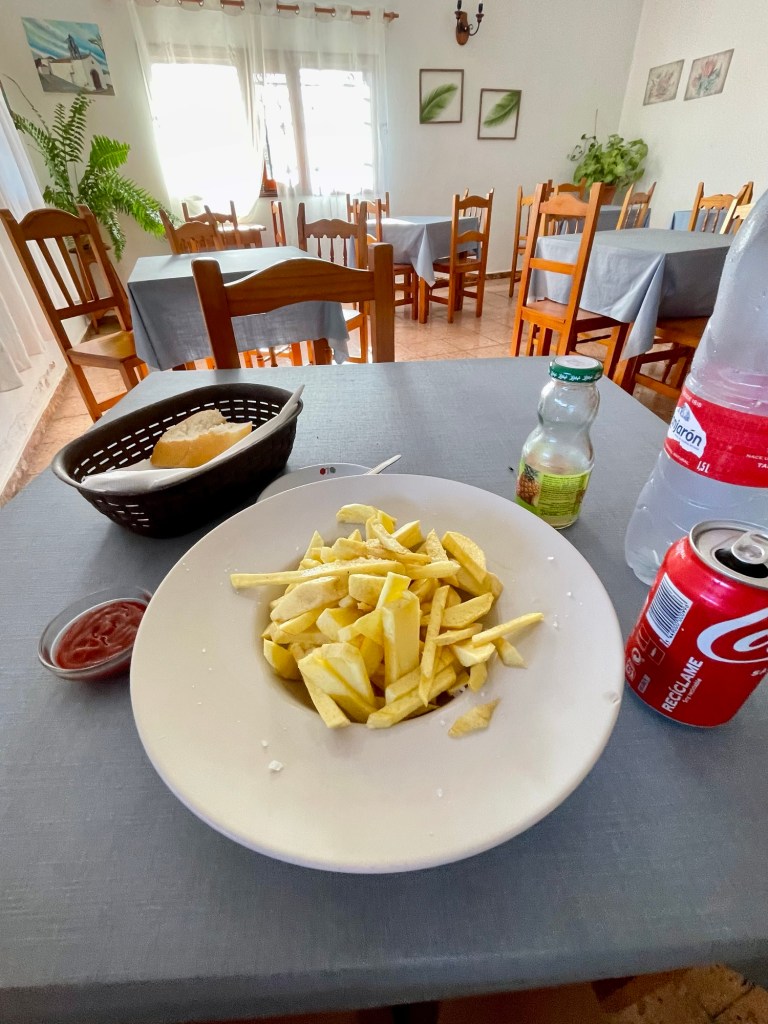 Aamupäivä oli kaikkinensa todella upea. Hakeuduin jossakin vaiheessa tuulen suojaan pitämään lounastaukoa ja sen jälkeen reitti lähtikin laskeutumaan alas kohti Cardónin kylää. Siellä kävin todella minimaalisessa kaupassa ostamassa leipää ja erilaisia juomia. Matka jatkui reippaasti sekä teitä että polkuja pitkin ja ohitin yksinäisen narun päässä olevan aasin, tuulivoimalan, ison vuohitilan ja pitkän päivän jälkeen saavuin viimein La Paredin rantakaupunkiin. Siellä hakeuduin ravintolaan syömään, juomaan ja latailemaan puhelintani.