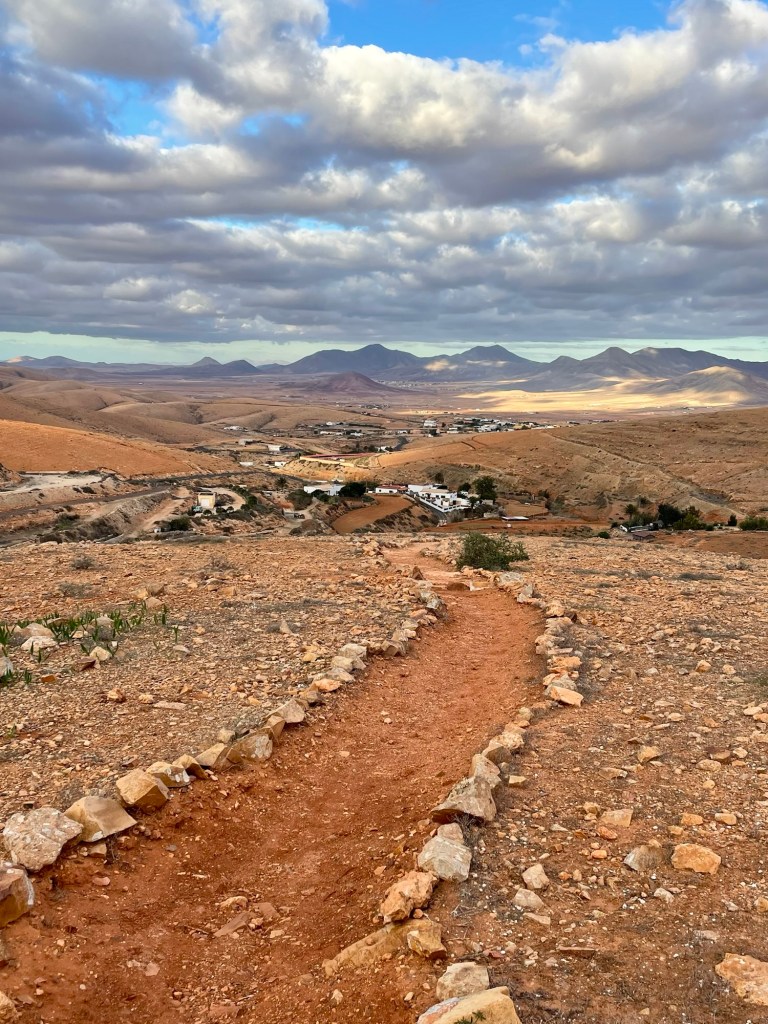 Sade oli poistunut ja tuulettomissa kohdissa oli todella lämmin. Syötyäni lähdin eteenpäin ja reitti lähti kiipeämään taas ylös vuorille. Nyt oli edessä yksi Fuerteventuran osuuden jyrkimmistä nousuista ja kipuaminen toi mieleeni La Gomeran maastot. Polku kiemurteli siksakkia ylöspäin ja välillä napsin salmiakkia, josta saa hyvää buustia hengästyttävissä paikoissa. Ylhäällä reitti ylitti taas autotien ja lähti laskeutumaan hiljalleen kohti Toton ja Pájaran kyliä. Maisema oli kauniin okranvärinen ja pienet pensaat siellä täällä toivat maisemaan vihreyttä. Polku oli reunustettu kivin, niin kuin monessa muussakin kohtaa, ja sitä oli helppo kulkea.