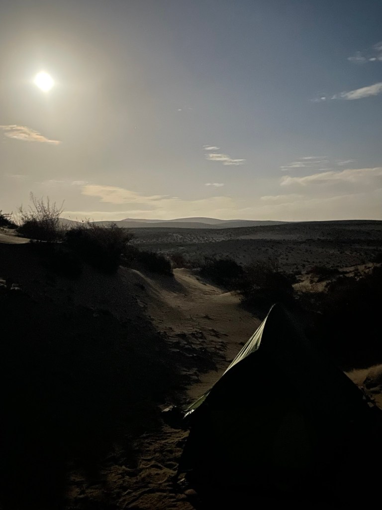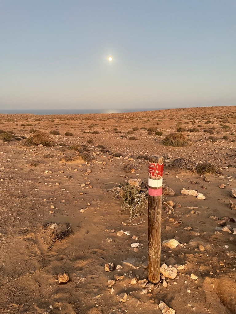 Tätä eksoottista etappia olin odottanut. Edessäni olisi reilu kymmenen kilometriä pelkässä hiekassa taivaltamista. Lähdin aamulla kuutamossa liikkeelle ja tunnelma oli mitä mahtavin. Ketään ei ollut missään ja tunsin olevani todellakin oikeassa autiomaassa.