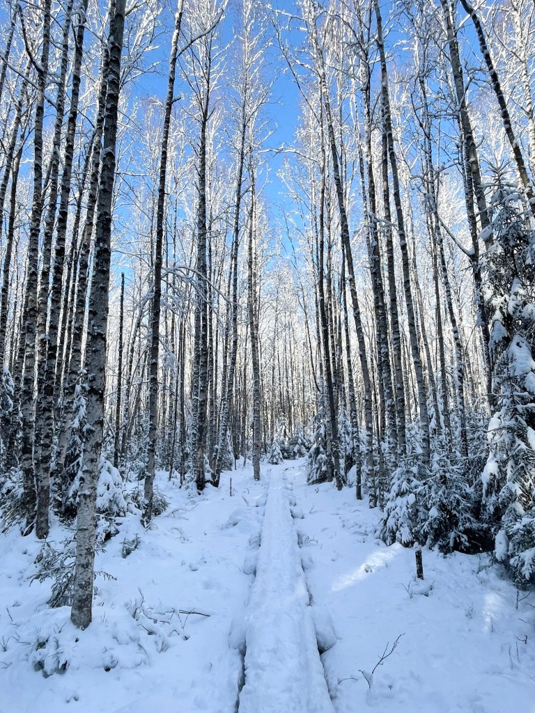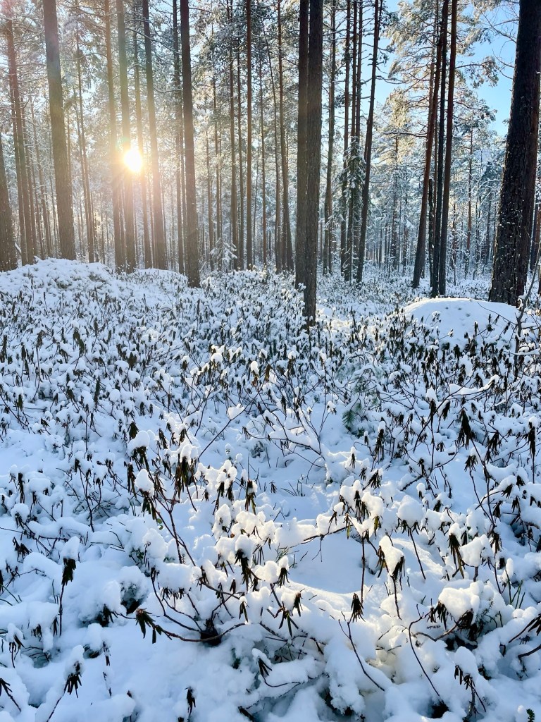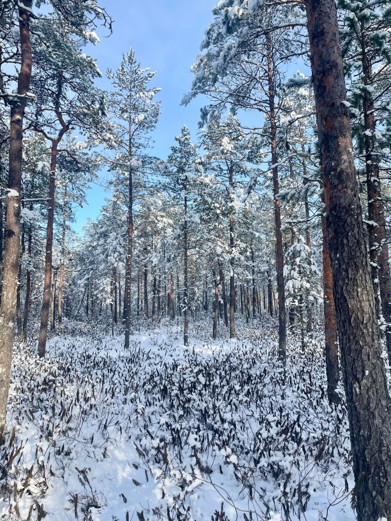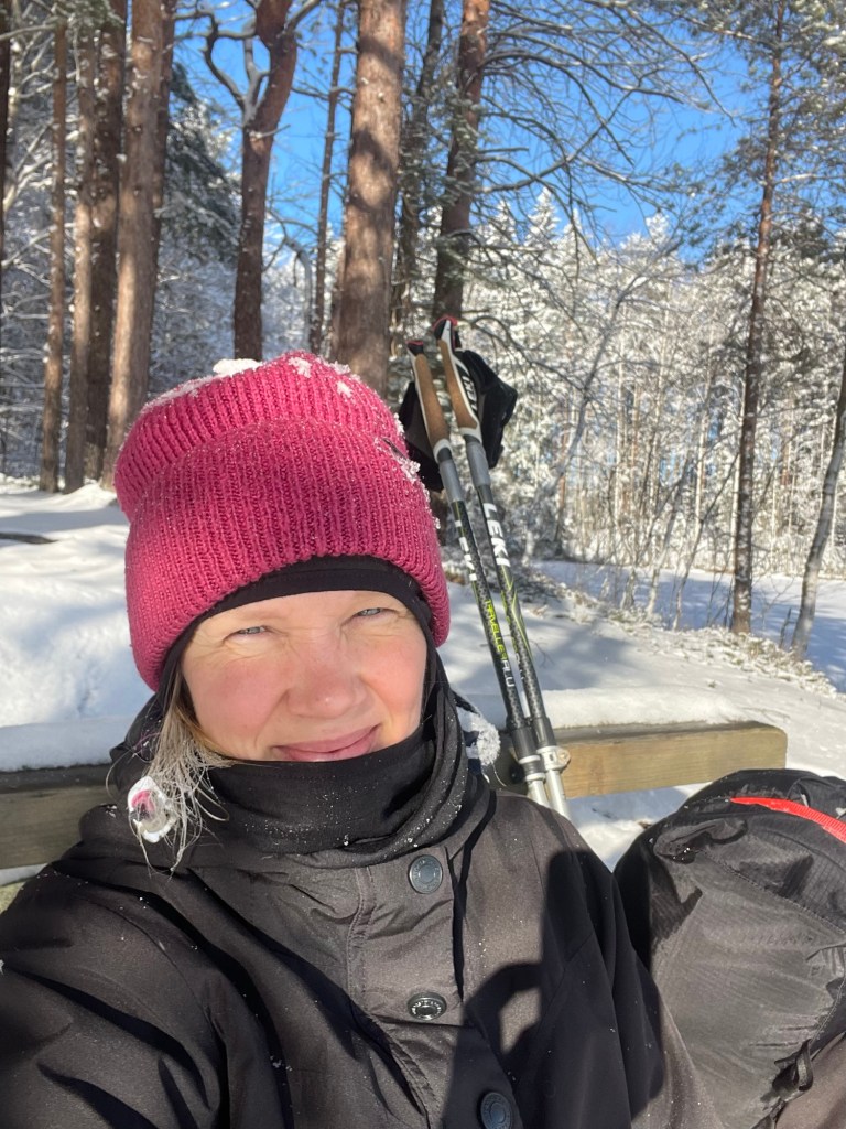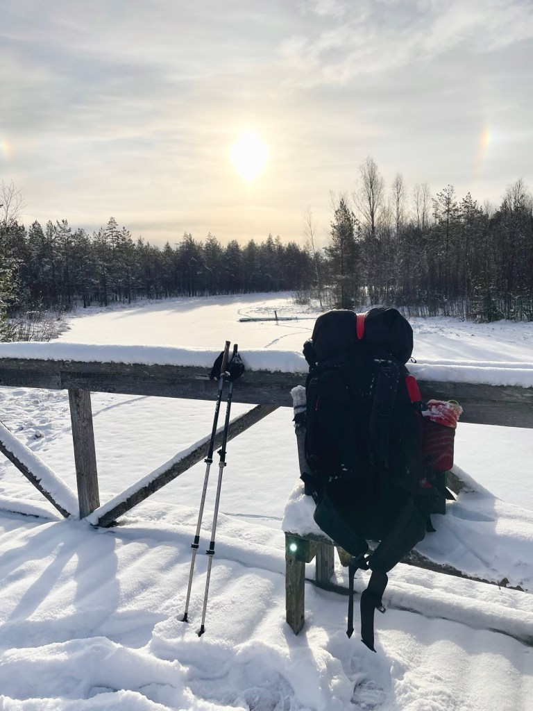 Vaellusta edeltävänä iltana kurkkuni oli hieman karhea, mutta aamulla olo oli ihan hyvä. Olen hyvin harvoin kipeänä ja tälläkin kertaa oletin pienen oireilun häviävän matkan varrella. Koko edellisen päivän oli satanut noin 10 cm lunta ja saapuessani Joutsijärvelle paistoi aurinko. Maisema oli kertakaikkisen kaunis, sillä kaiki puut olivat lumen peitossa. Tuuli tiputteli välillä pieniä lumipaakkuja alas, jotka hajosivat oksiin osuessaan tuhansiksi välkkyviksi kimalteiksi.