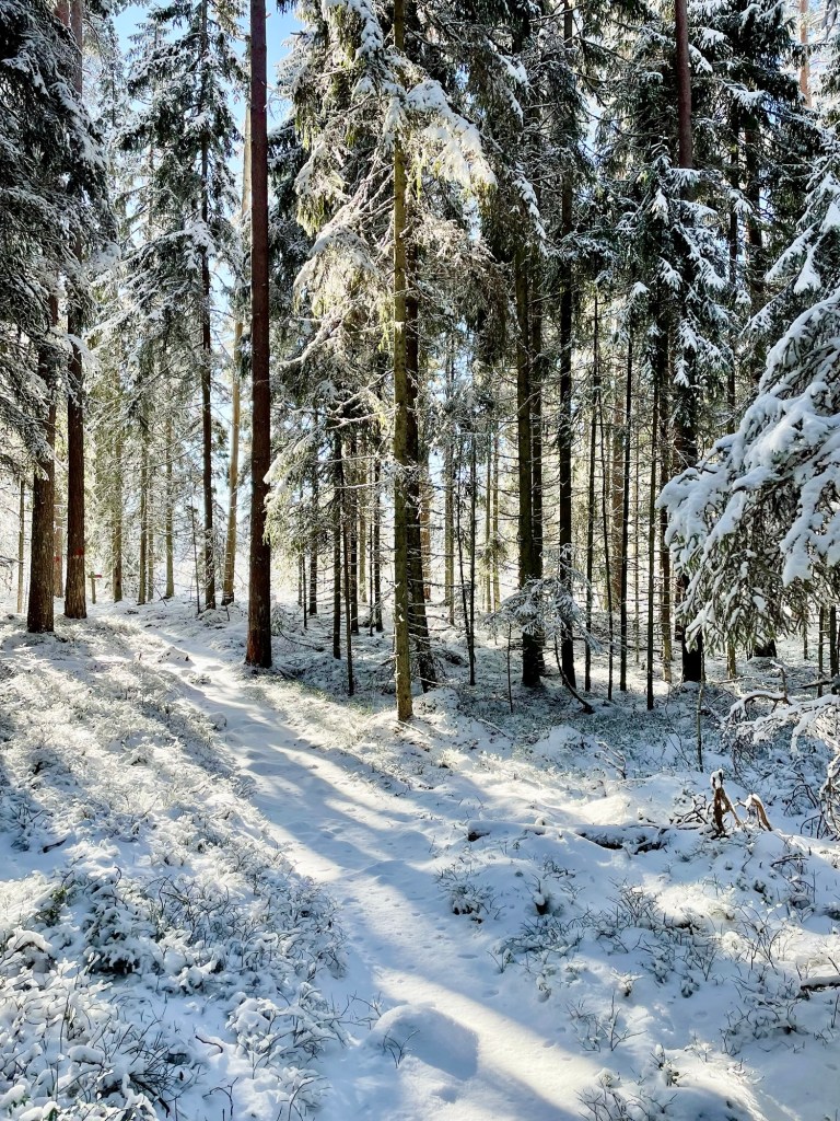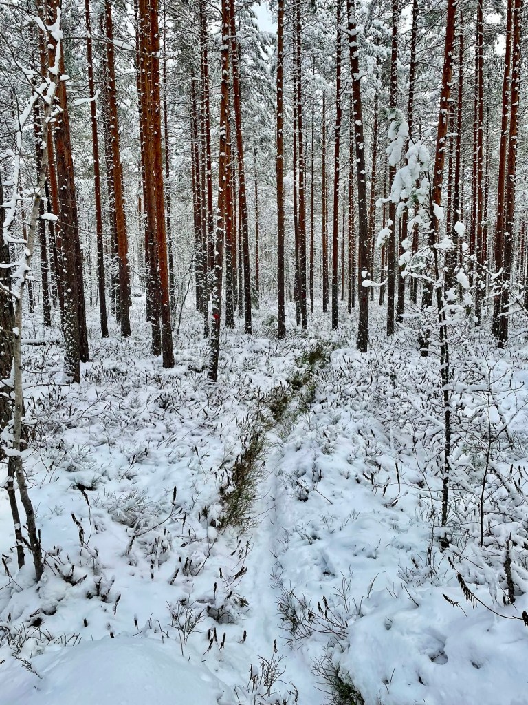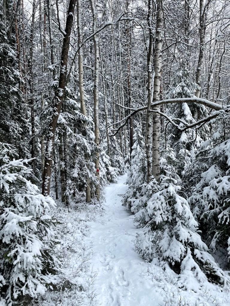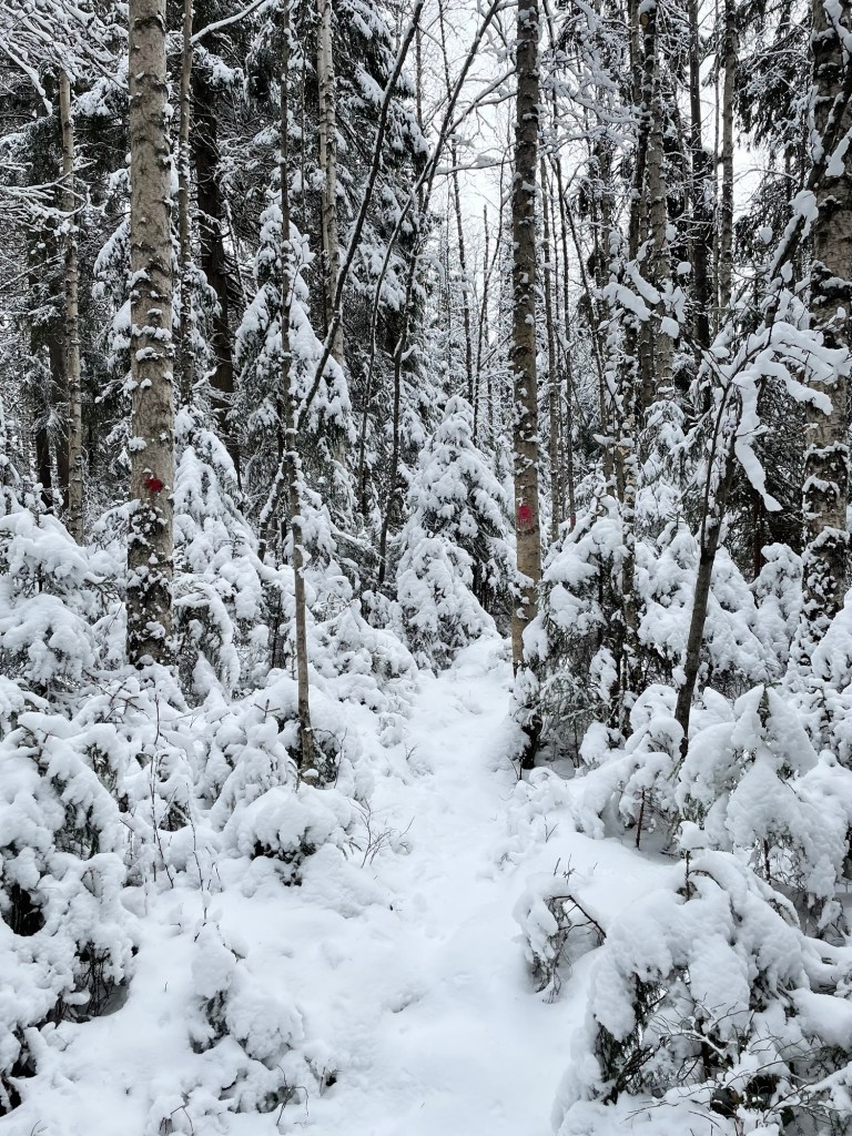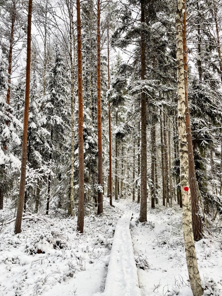 Polulla oli juuri sopivasti lunta, ei tarvinnut kahlata, se ei ollut liukas, vaan kauniin valkoinen ja selkeä. Polku oli merkitty punaisin maalitäplin, mutta sitä pystyi seuraamaan lumesta huolimatta myös katseellaan. Polku kulki metsässä, joka oli mukavan vaihtelevaa. Alussa ohitin joen varressa olevan Tammen leirikeskuksen, jonka jälkeen saavuin lyhyelle pätkälle, jossa kaatuneiden puiden takia joutui etsimään sopivaa reittiä jostain polun ulkopuolelta.