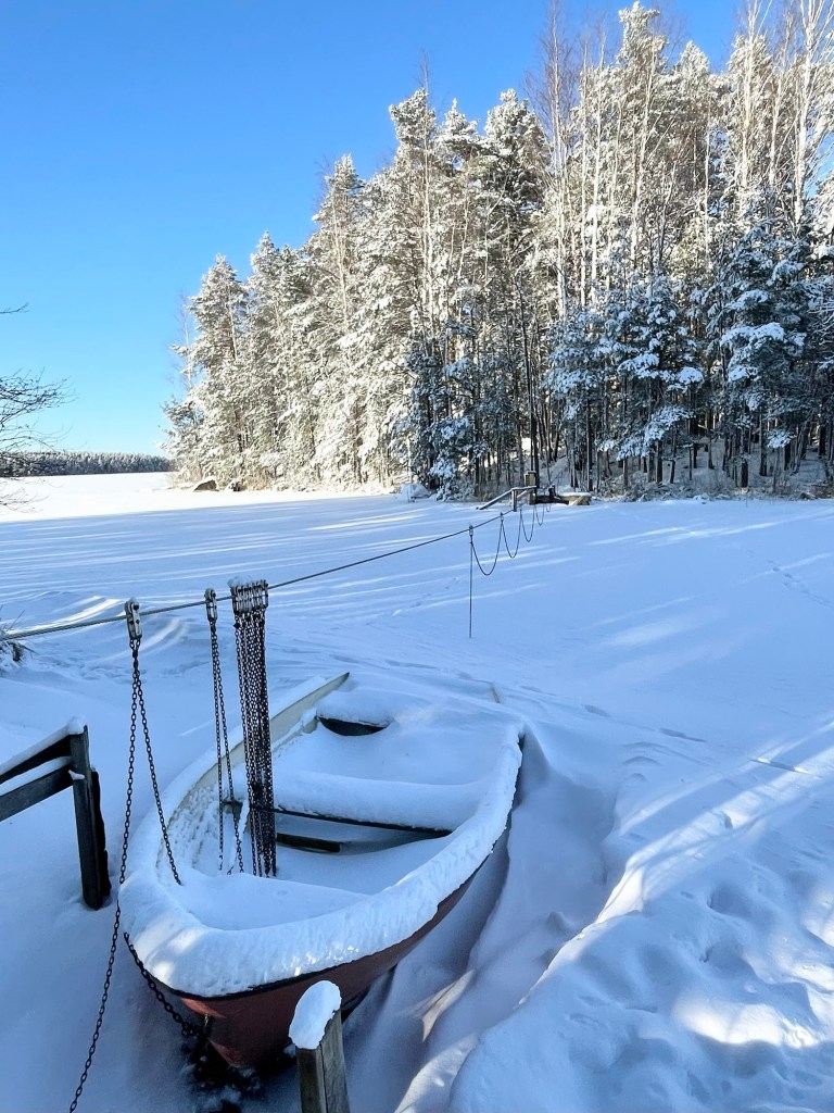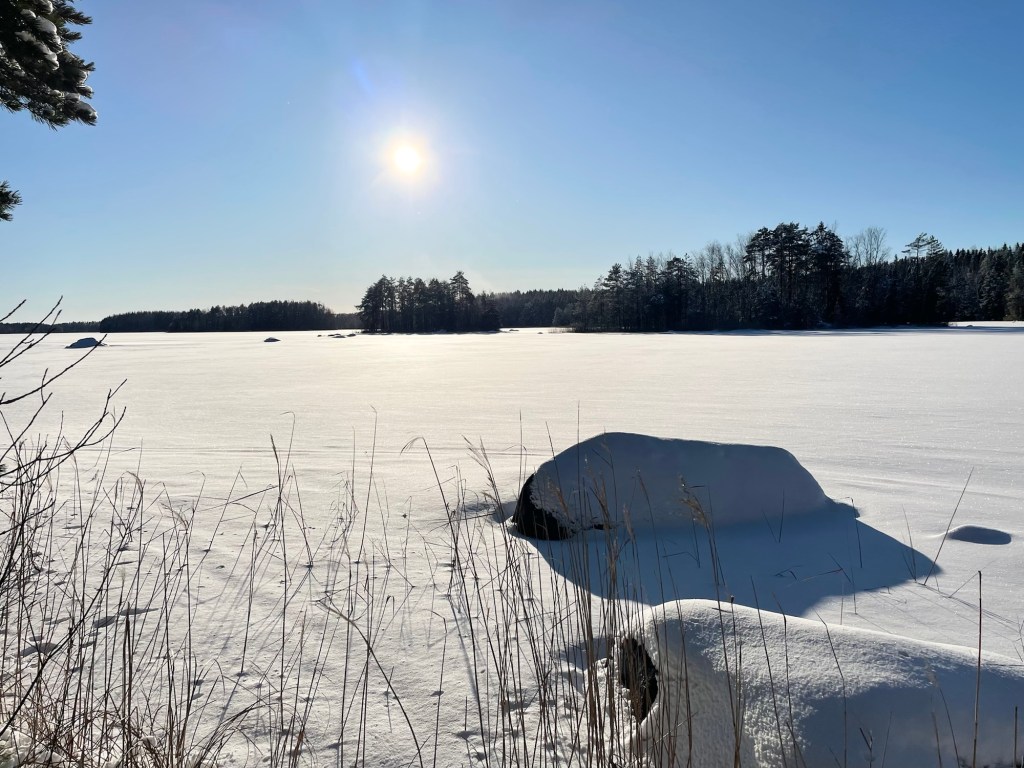 Nälkä alkoi kurnimaan vatsassa ja olin päättänyt pitää lounastauon venelossien luona. Olin lukenut jostain, että ylityskohdat sisältävät virtapaikkoja ja jää saattaa olla niistä kohdista auki. Olin varautunut kiertämään sulat kohdat kauempaa jäätä pitkin, mutta paikalle saapuessani ne näyttivät olevan paksussa jäässä. Veneet odottivat lumeen hautautuneina kevään tuloa. Uskalsin marssia suoraan jään yli, koska joku muukin oli siitä vasta kävellyt. Saavuin ihanaan pieneen saarekkeeseen, jossa hakeuduin rantaan pitääkseni lounastauon. Aurinko paistoi makeasti ja oli ihana istua paikallaan kiireettömästi imien auringon lämpöä jokaiseen soluun. Maisema oli valkoinen, hiljainen ja kulkematon.