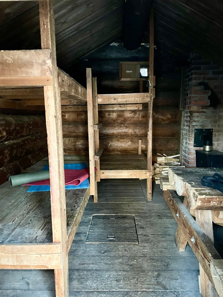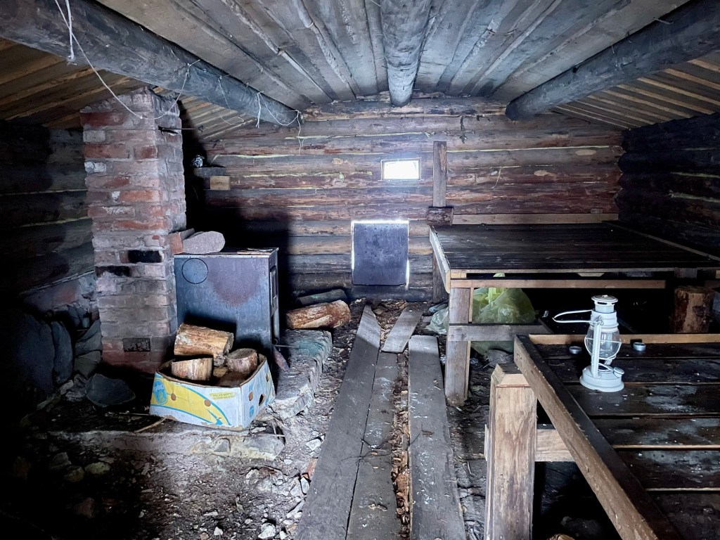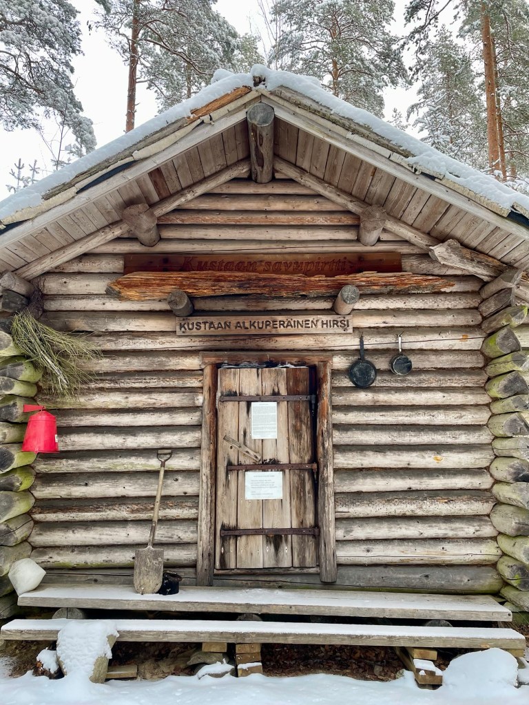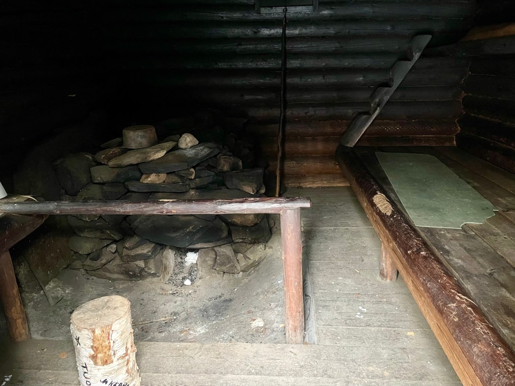 Korsulta jatkoin polkua pitkin kohti seuraavaa mielenkiintoista kohdetta, Kustaan savupirttiä. Savupirtti on siis tupa, joka lämmitetään ikäänkuin kiukaalla eli valtavan kiviröykkiön alle laitetaan tulet. Tuvassa ei ole piippua, vaan savut tulevat ovesta ulos. Kun kivet ovat lämmenneet, tulet sammutetaan ja ovi laitetaan kiinni, jolloin kivet pitävät tuvan lämpimänä. Tässä Kustaan pirtissä kivet olivat alkuperäiset, pirtti puolestaan oli rakennettu uudestaan vanhan tilalle. Täällä olisikin tosi mielenkiintoista viettää yö ja kokeilla ylipäätään savupirtin lämmittämistä. Savupirtin pihapiiristä löytyi myös kota.