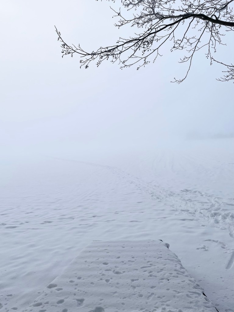 Aamu oli sumuinen ja rannassa käydessäni maisema oli aivan piilossa, vastassa oli vain vaalea seinä. Sumu leijui myös metsikössä, kun lähdin kävelemään ja oli vaihteeksi ihanan kevyttä kävellä ilman rinkkaa. Polku oli koskematon, mutta lunta ei ollut liikaa ja siinä oli mukava kävellä. Polku oli paikoin kivikkoinen, mutta ilman rinkkaa ihan kohtuullinen kuljettava. Ohitin reipasta tahtia Kakkurin laavun ja jatkoin matkaa kohti korsua. Täällä polulla olikin tosi isoja lohkareita, joiden kohdalla täytyi olla tarkkana, ettei jalka luiskahda kiven koloon. Korsu ilmestyi näkösälle ja se oli hyvin matala rakennelma. Kurkkasin sisälle ja se oli hieman roskainen ja maalattian kanssa ei niin houkutteleva, mitä tuvat yleensä ovat. Ulkopuolelta löytyneessä kyltissä kerrottiin, miten korsussa oli asustellut sodan aikaan metsäkaartilaisia eli rintamakarkulaisia. Korsun takana oli ilmeisesti myöhemmin rakennettu laavu. Korsu pisti miettimään sotaa ja elämää karkuruuden alla.