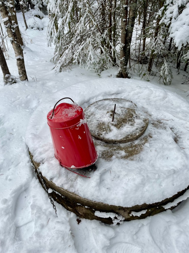 Reitti palasi kohti Sisälmystenlahtea ja matkan varrella oli kaivo. Pohjalla oli jonkun verran vettä ja sain täytettyä litran pullon kaivovedellä. Kaivo sijaitsee puolen kilometrin päässä Sisälmystenlahden autiotuvalta.