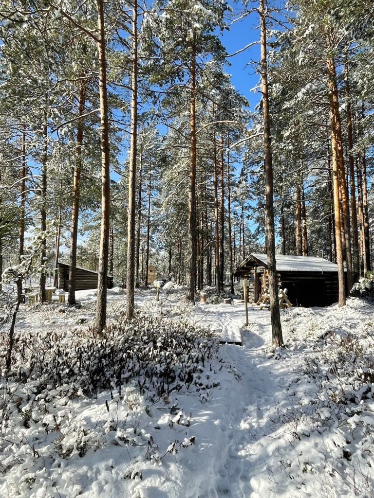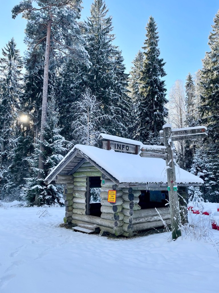 Olin vaeltanut parin yön taktiikalla Joutsijärven ympäri kulkevan reitin ja halusin tutustua vielä reissuni lopuksi luontopolkuun. Jätin rinkan autoon ja pääsin kepeästi matkaan ilman lisäpainoja. Sää oli taas upean aurinkoinen ja muutama päivä sitten satanut lumi viipyili vielä kuusten oksilla tehden maisemasta todella kauniin.