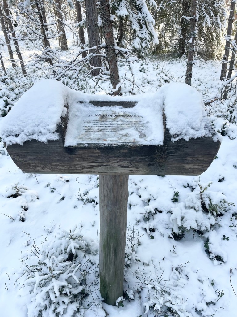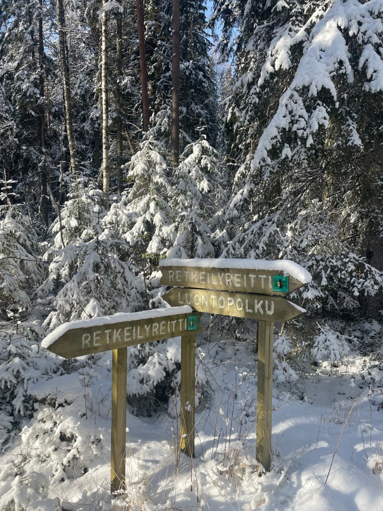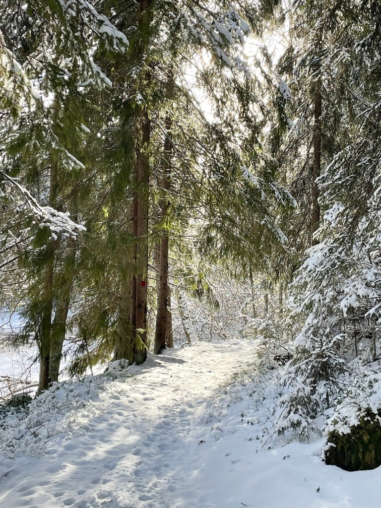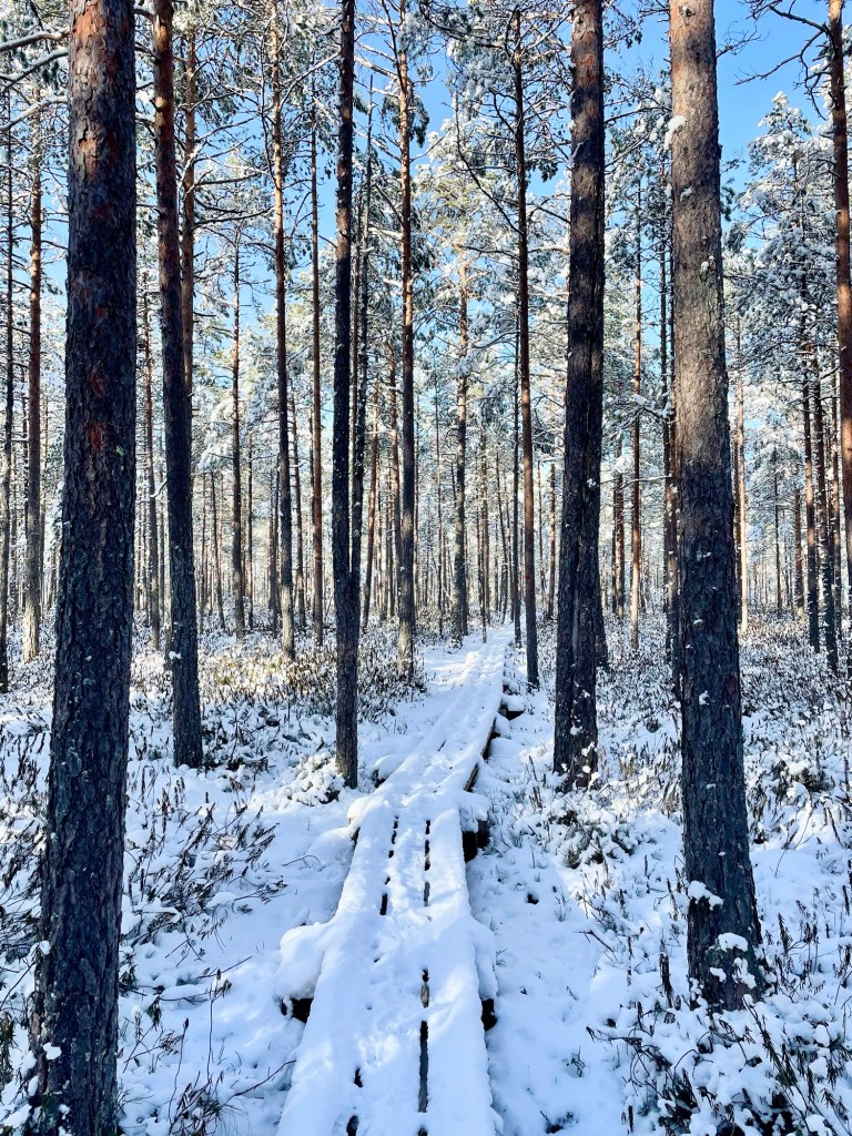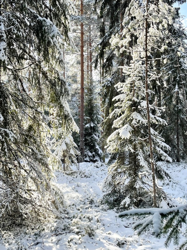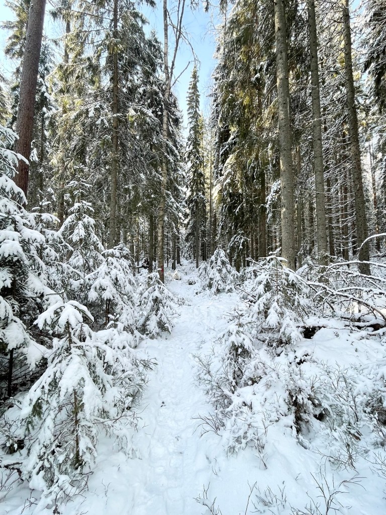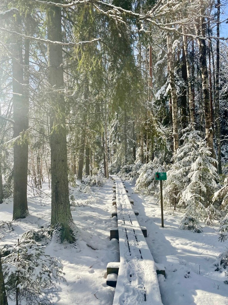 Pitkospuut sukelsivat metsään kuusten oksien alle seuraten jokea. Aurinko paistoi oksien välistä ja maisema oli todella kaunis. Pian polku jätti joen ja kulki vaihtelevissa metsiköissä. Lunta oli juuri sopivasti, polulla ei ollut hankala kävellä eikä se ollut onneksi liukas. Vaikka oloni oli flunssainen, olin tyytyväinen, että lähdin matkaan. Eteläsuomalaisessa talvessa juuri satanut puhdas lumi ja aurinko ovat harvinaista luksusta.
