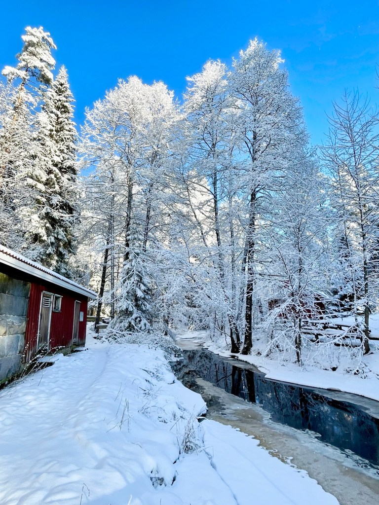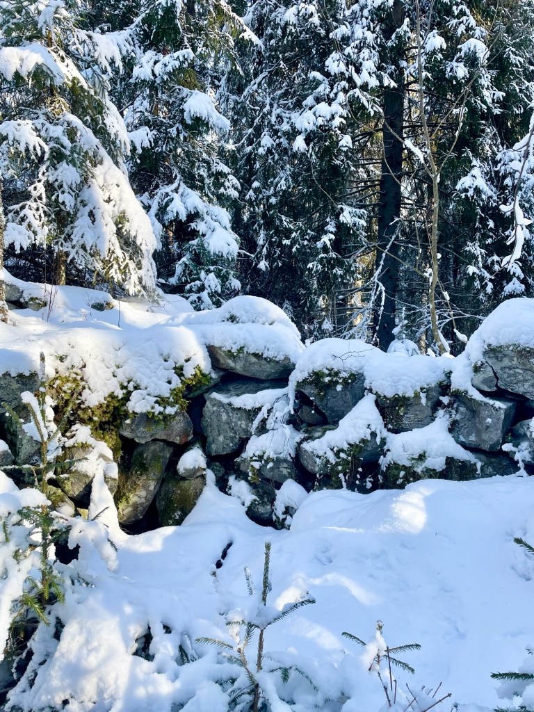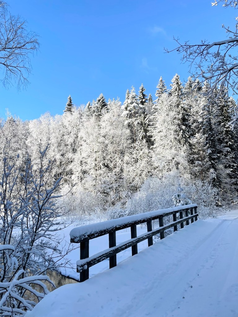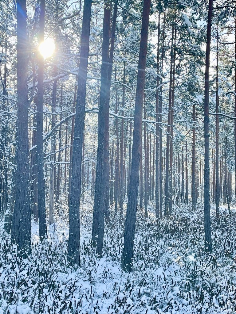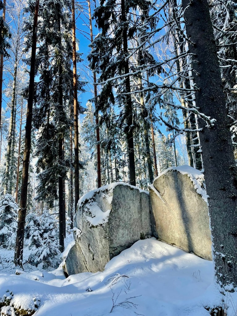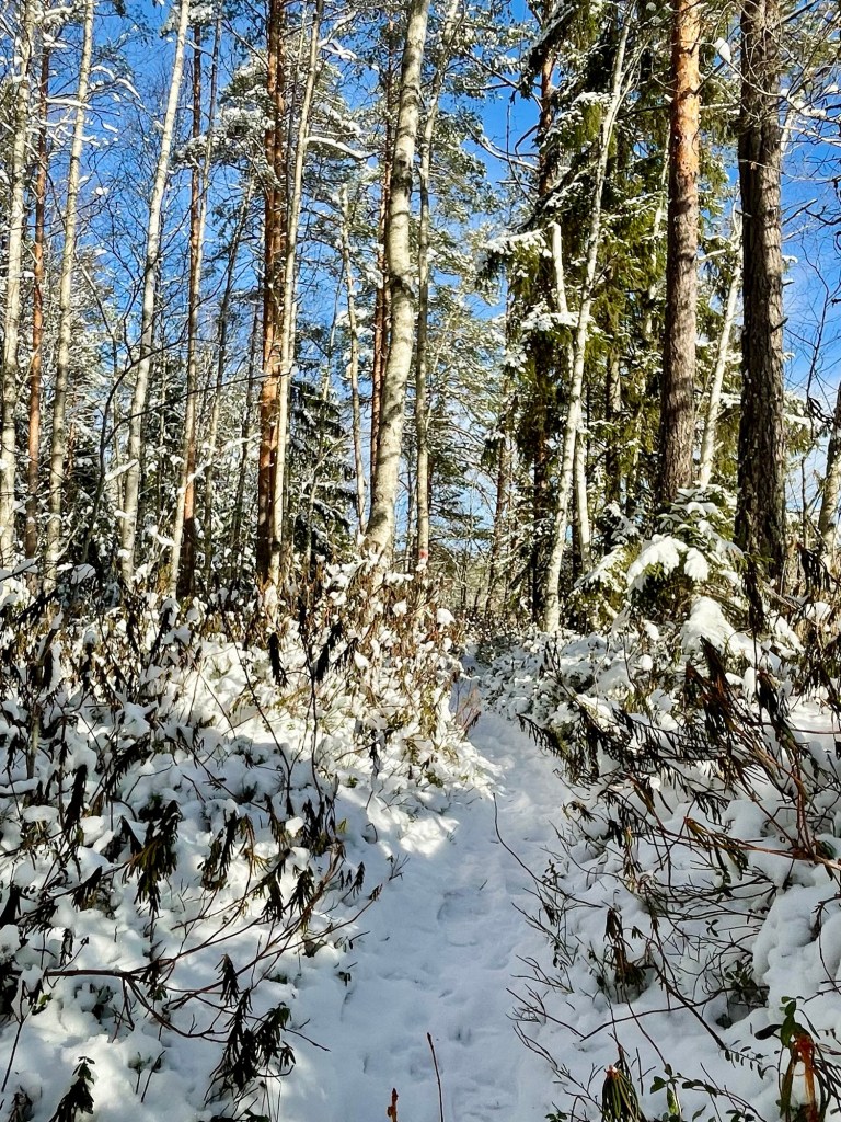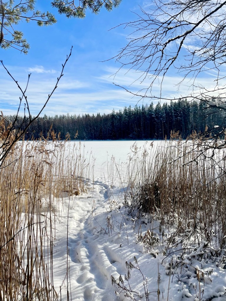 Pitkospuut sukelsivat metsään kuusten oksien alle seuraten jokea. Aurinko paistoi oksien välistä ja maisema oli todella kaunis. Pian polku jätti joen ja kulki vaihtelevissa metsiköissä. Lunta oli juuri sopivasti, polulla ei ollut hankala kävellä eikä se ollut onneksi liukas. Vaikka oloni oli flunssainen, olin tyytyväinen, että lähdin matkaan. Eteläsuomalaisessa talvessa juuri satanut puhdas lumi ja aurinko ovat harvinaista luksusta.