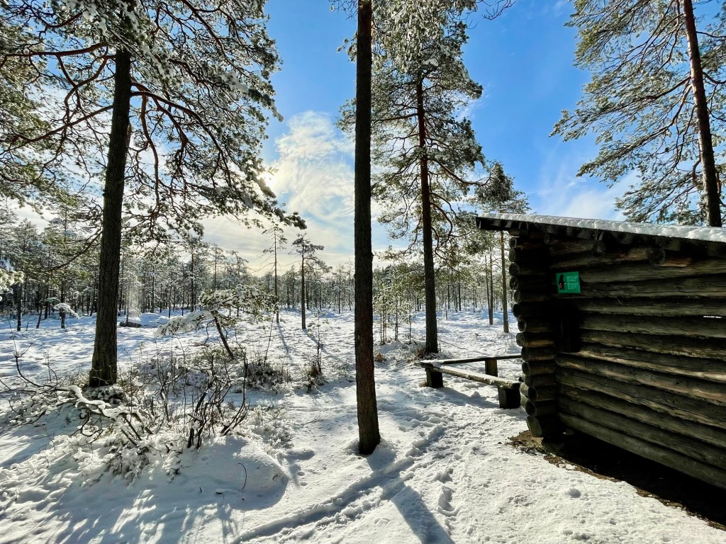 Pitkokset kulkivat kauniiden metsäisten suoalueiden läpi ja suopursun pystyi haistamaan näin talvellakin. Saavuin Siltainsuon laavulle, joka oli todella kivassa paikassa suon reunassa. Tunnelma oli erämainen ja hiljainen. Tälläkin laavulla olisi mukava joskus viettää yö.